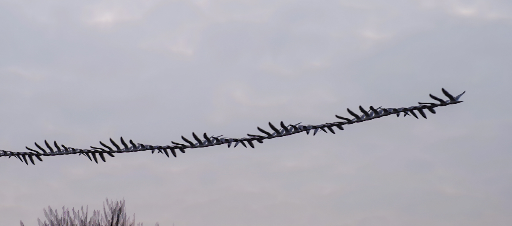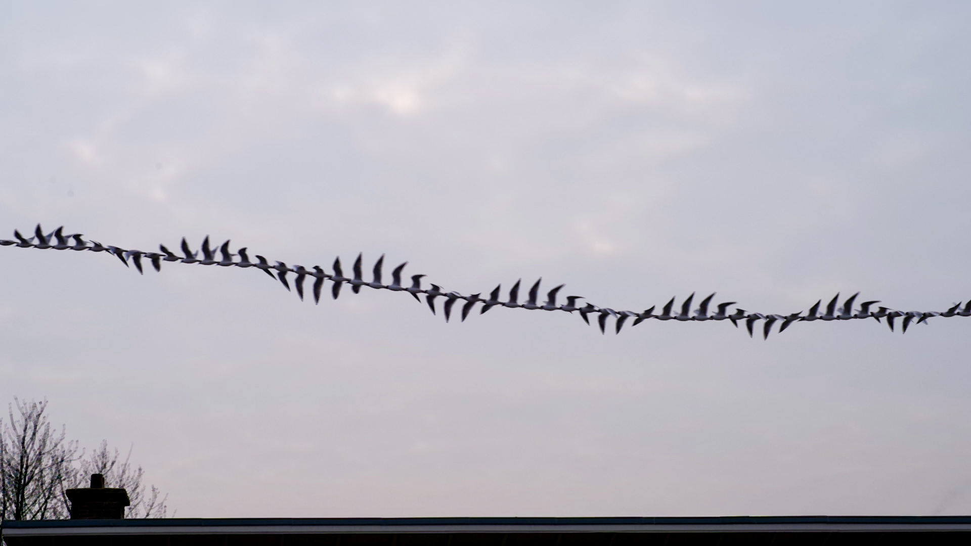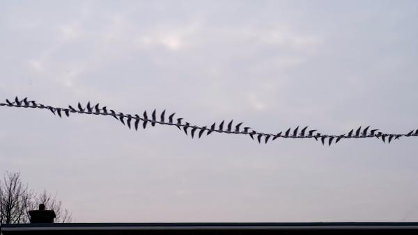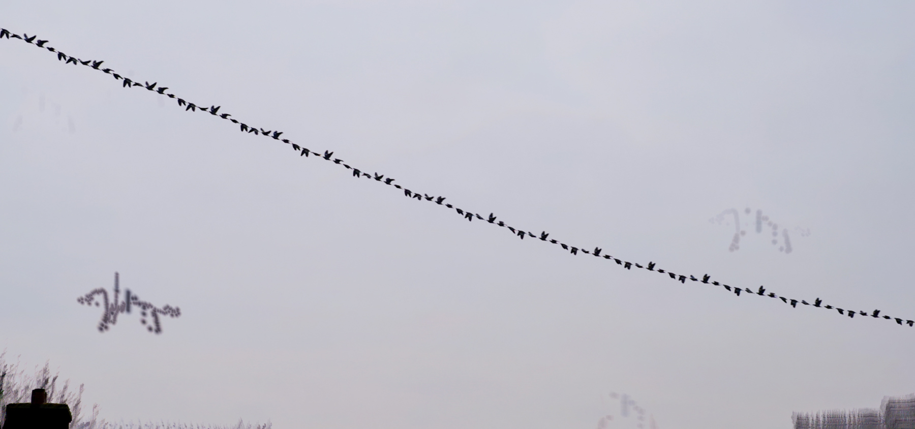 Birds flying. Where from? Where to? Flapping their wings. Constrained by physics; but free in three dimensions. What if we could see ourselves moving throught time? Would our motions be a fluidic as these birds?